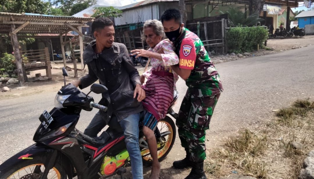 Pada saat pelaksanaan penyaluran BLT Minyak Goreng di Pos Sub Koramil Boas, pada Selasa (7/6/2022), terlihat dengan penuh ketulusan Babinsa Praka I Wayan Riko Riana membantu Mama Maria turun dari sepeda motor dan memapahnya menuju ke lokasi penyaluran BLT.