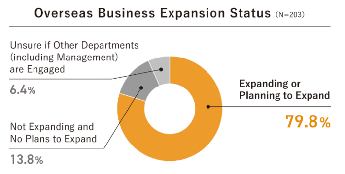 Minat Tinggi pada Ekspansi Luar Negeri: Sekitar 80% perusahaan Jepang menyatakan minatnya dalam mengembangkan bisnis luar negeri atau berencana melakukannya di masa depan. Hal ini mencerminkan minat yang signifikan dalam pengembangan bisnis luar negeri yang sedang berlangsung atau akan datang.