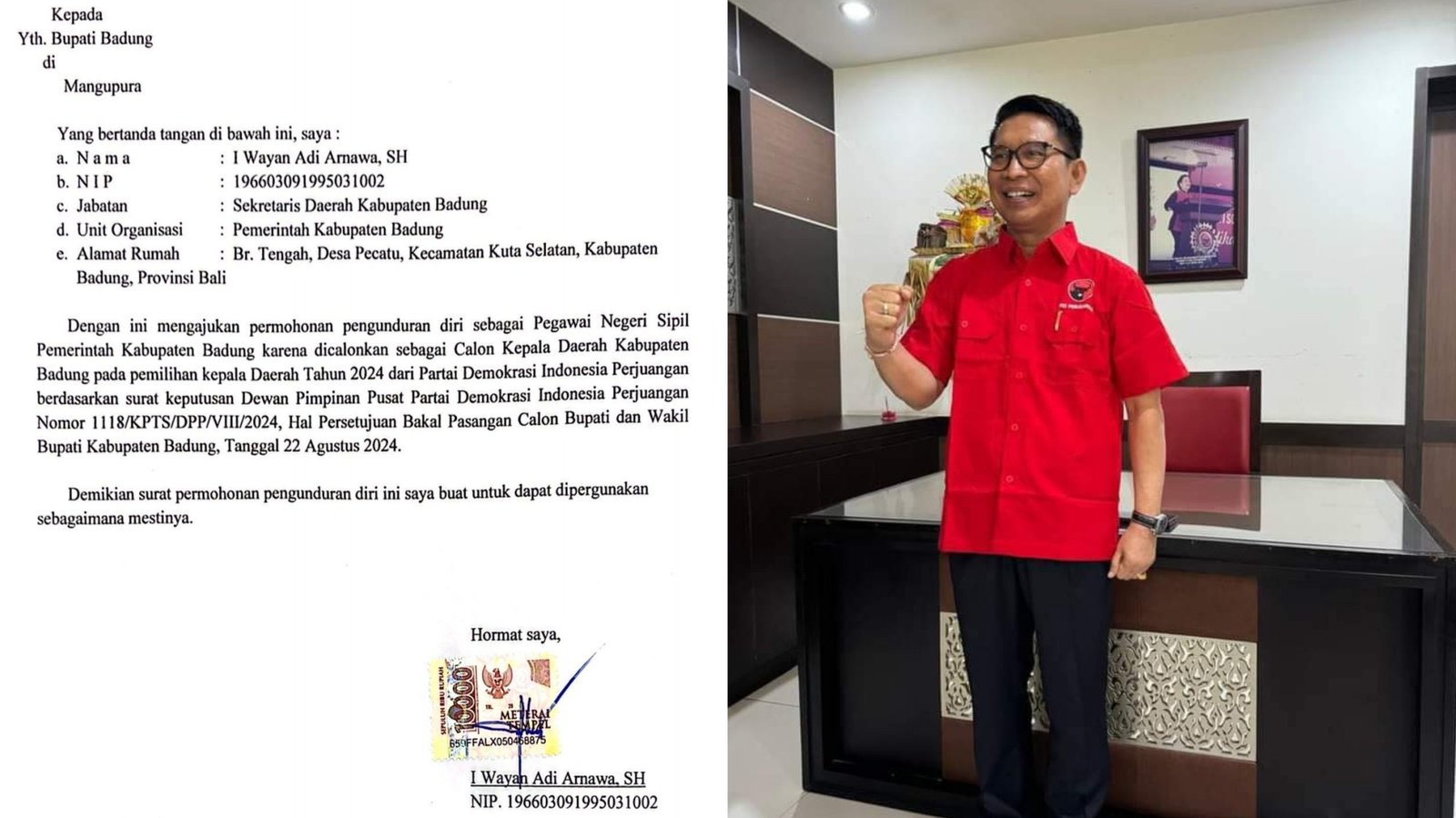 Kolase foto: Sekda Kabupaten Badung, I Wayan Adi Arnawa, resmi mengajukan surat pengunduran diri dari jabatannya sebagai Pegawai Negeri Sipil (PNS) yang ditujukan kepada Bupati Badung dan sudah mengenakan seragam merah PDI Perjuangan. (Sumber: barometerbali/213)