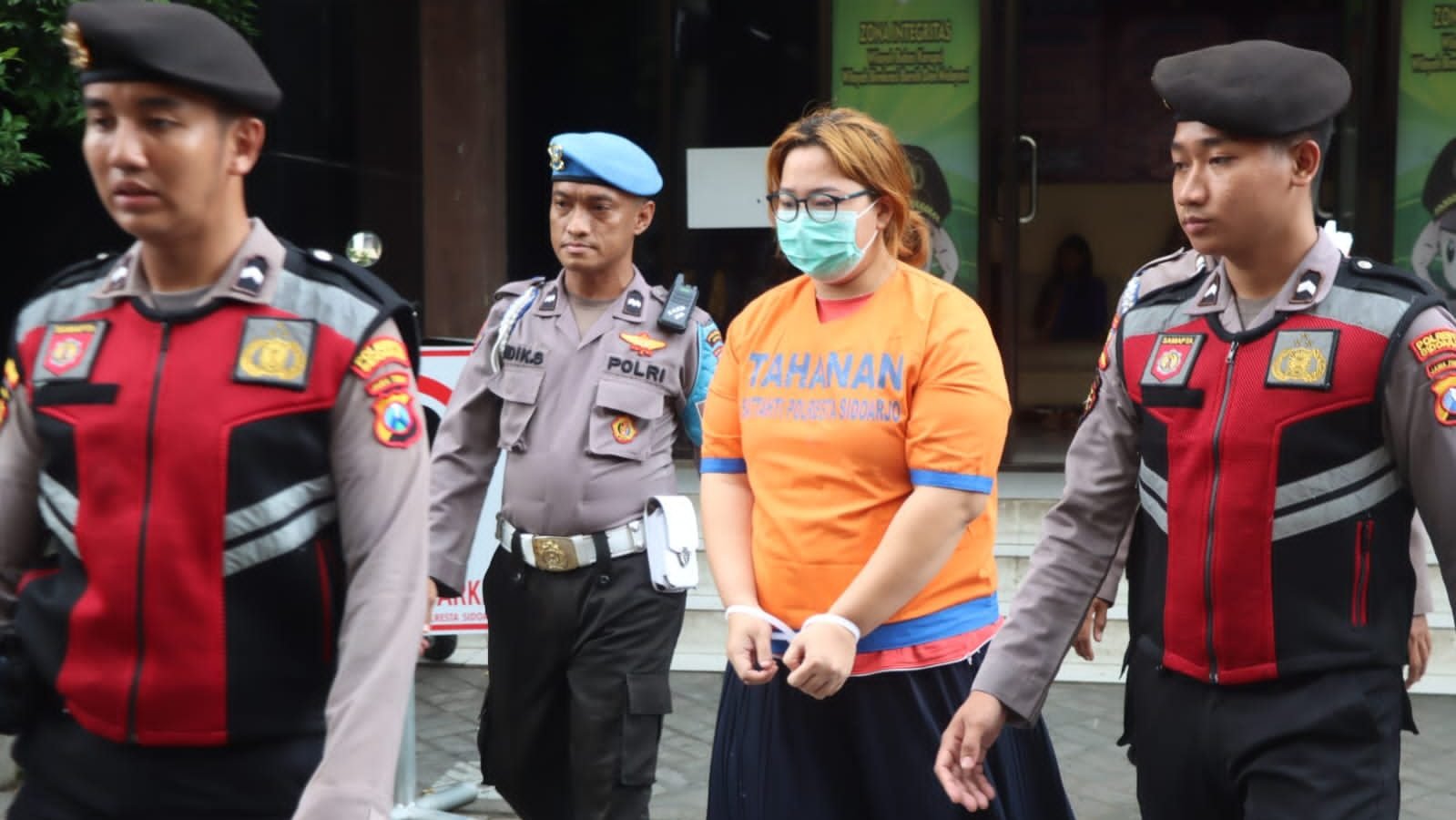 Foto: Seorang ibu berinisial RA yang lakukan kekerasan fisik pada anak kandungnya saat diamankan Satreskrim Polresta Sidoarjo. (barometerbali/redho)