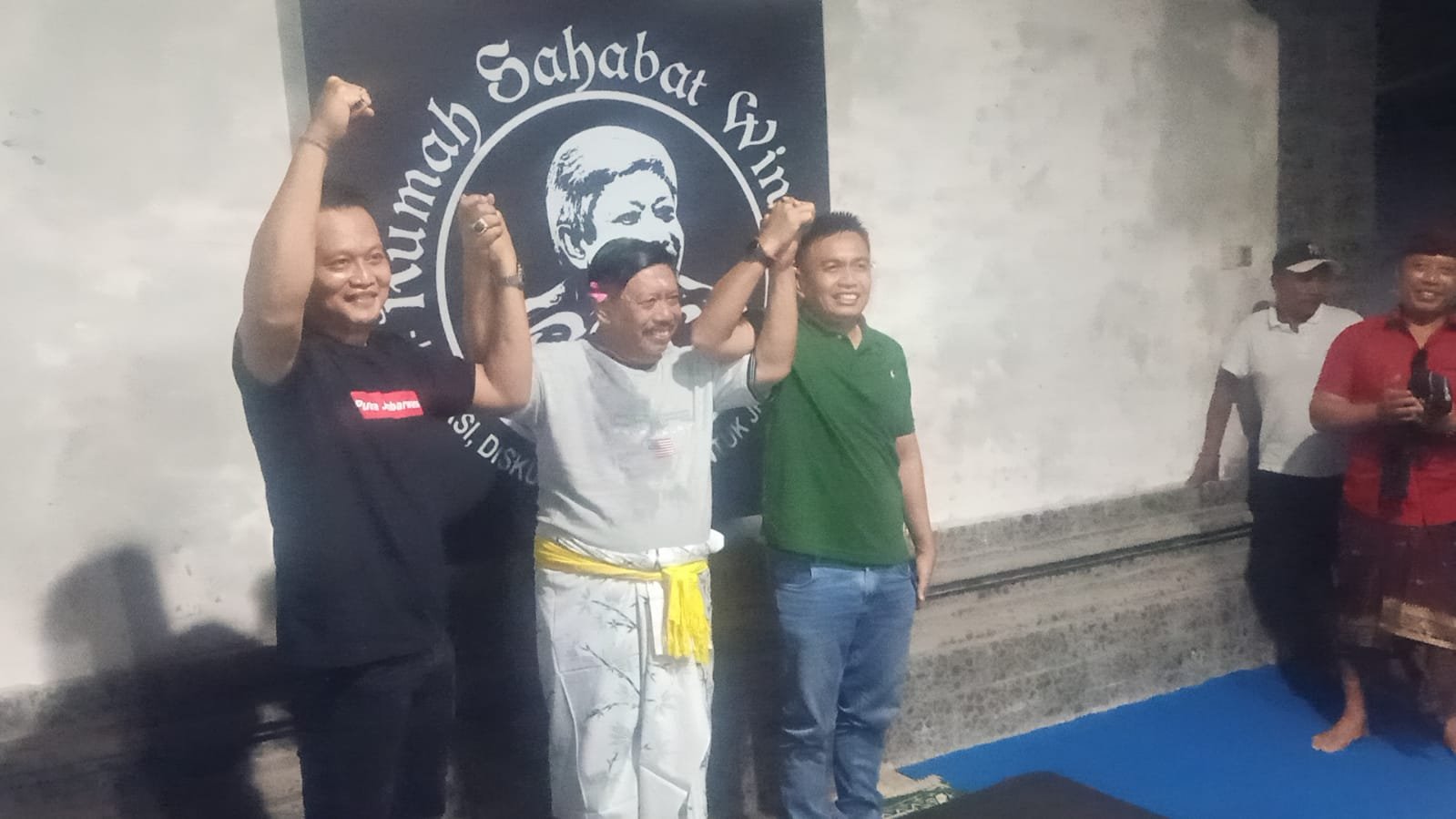 Ket foto: Prof I Gede Winasa (tengah) diapit Kembang Hartawan (kiri) dan I Gede Ngurah Patriana Krisna alias Ipat (kanan) menemui warga yang menyambut kebebasannya di kediamannya di Kelurahan Tegalcangkring, Mendoyo, Jembrana Jumat malam (05/07/24). (Sumber: barometerbali.com/217)