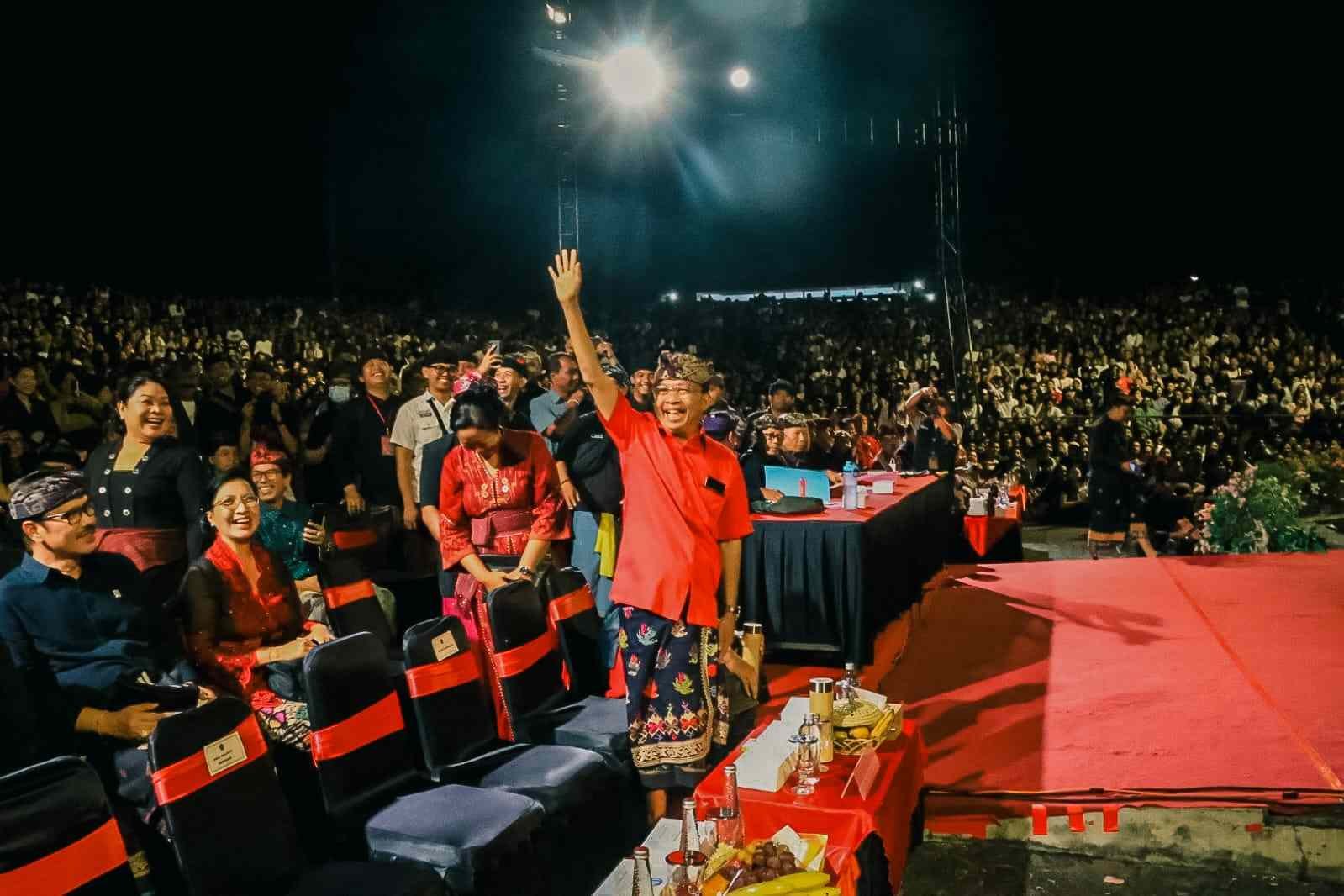 Mendapat sambutan yang begitu hangat dari penonton, Gubernur Koster secara bergantian menyapa mereka yang duduk di sisi kanan dan kiri panggung utama.