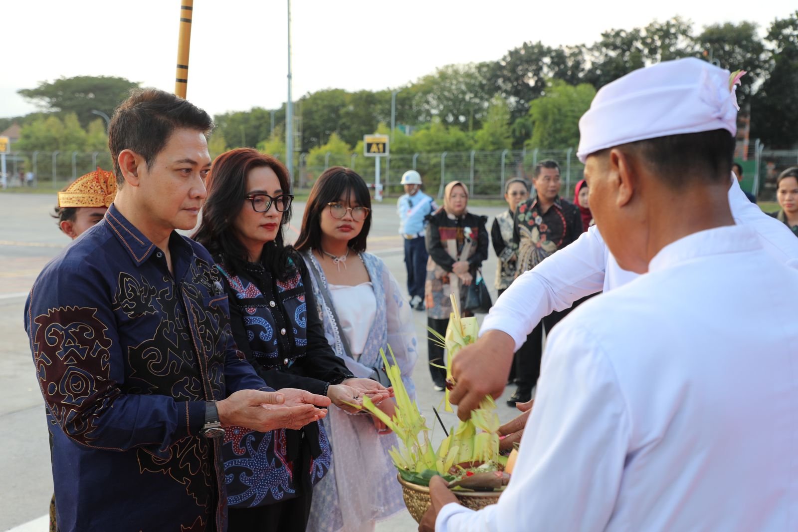 Ket foto: Kapolda Bali Irjen Pol Daniel Adityajaya (kiri) bersama istri, Ny Didit Daniel Adityajaya disambut jero mangku dengan tradisi tepung tawar setibanya di Base Ops Lanud I Gusti Ngurah Rai, Bali. (Sumber: barometerbali/dy)