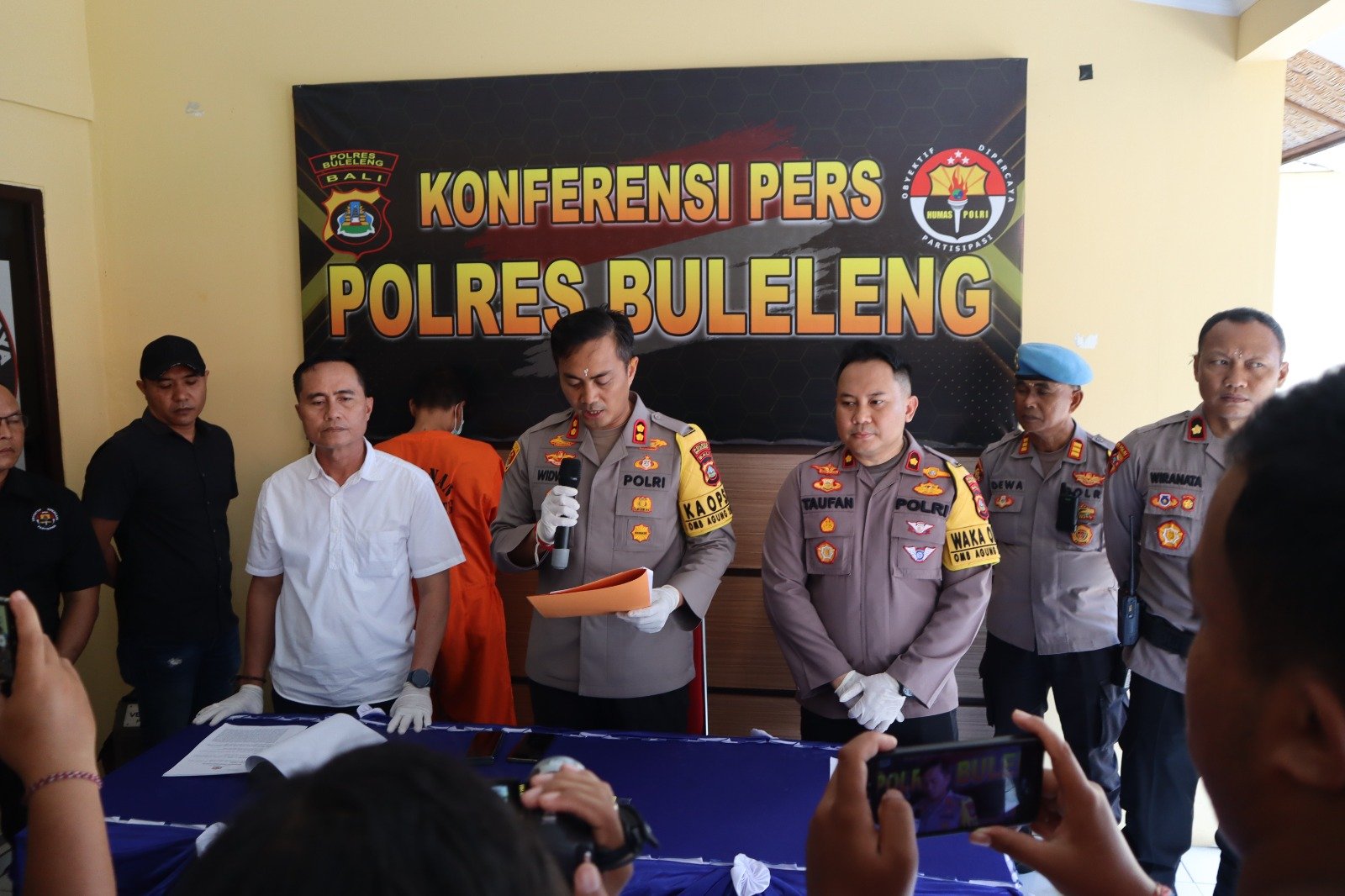 Orang nomer satu di Polres Buleleng AKBP Ida Bagus Widwan Sutadi, memimpin press release terhadap pengungkapan tersebut, dengan didampingi Waka Polres Buleleng, Kasat Narkoba dan Kasi Humas Polres Buleleng, di Mapolres Buleleng, Sabtu (30/12/2023).