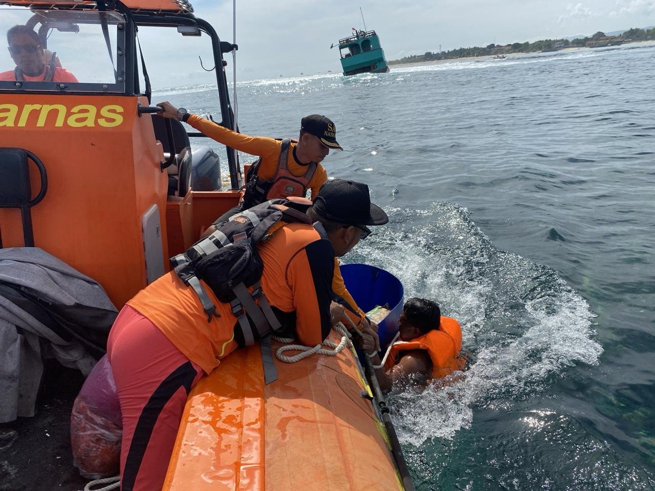 Foto: Tim SAR gabungan berhasil mengevakuasi crew KM Naga Mas Perkasa 58 yang kandas di perairan Jungut Batu Lembongan, Kecamatan Nusa Penida, Kabupaten Klungkung, Rabu (3/4/2024). (Sumber: BB 69/ay).
