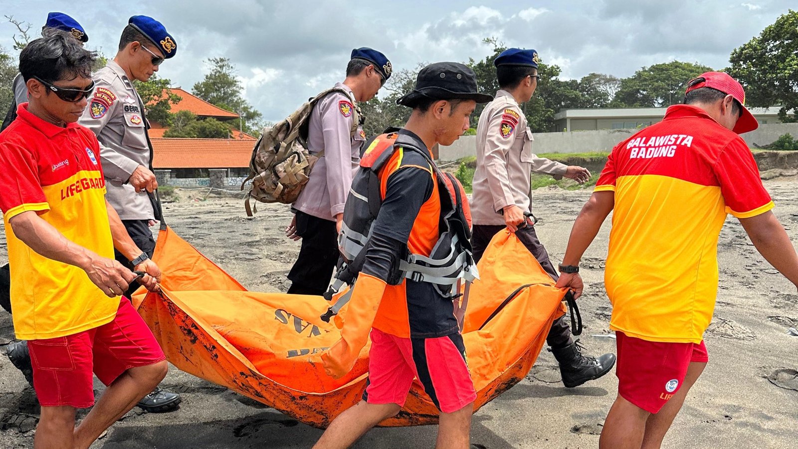 Foto: Evakuasi jenazah korban tenggelam oleh tim SAR gabungan di Pantai Berawa, Tibubeneng, Kuta Utara, Badung. (BB/HMS)