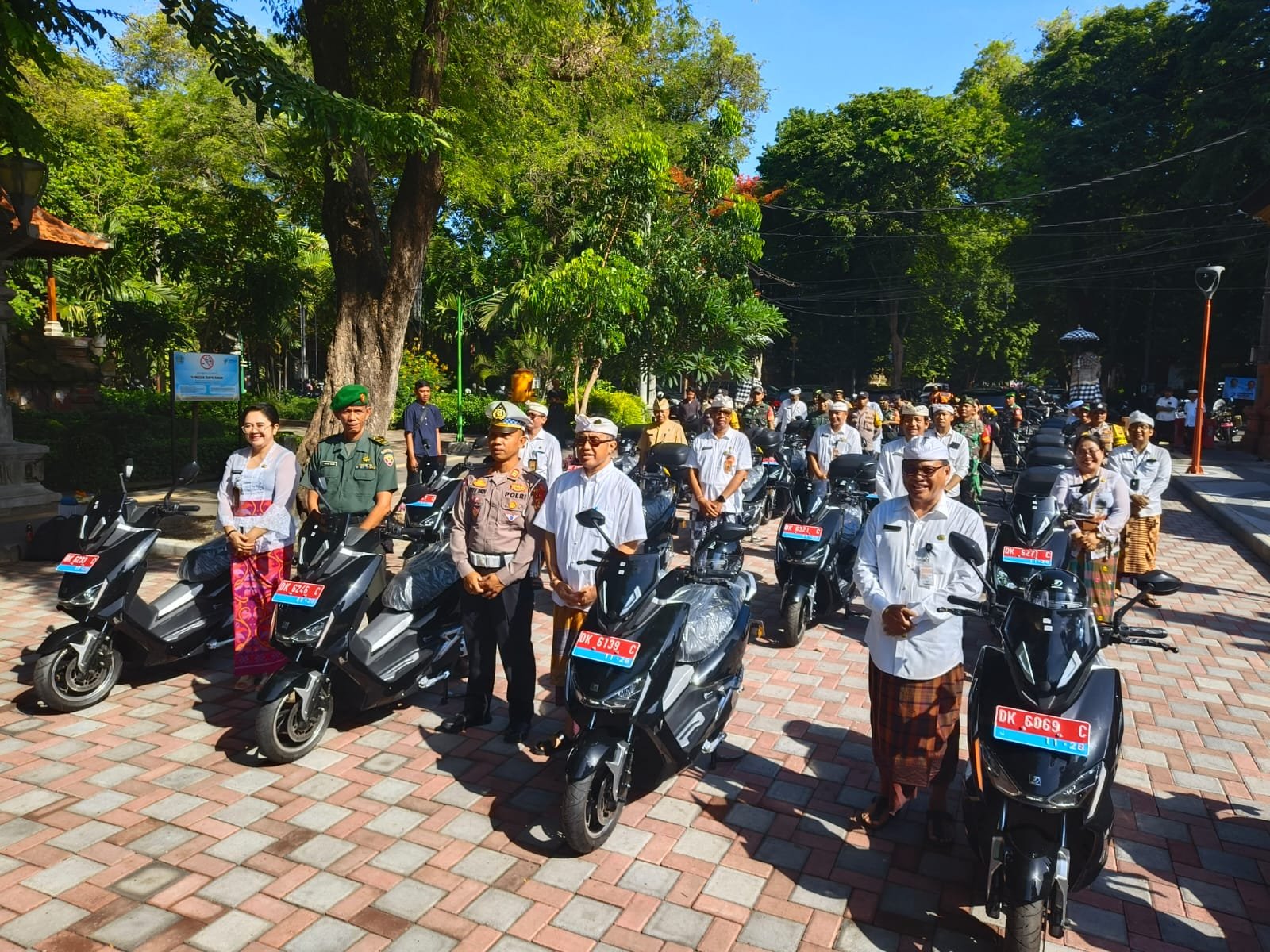 Denpasar | barometerbali – Sebanyak 142 unit Kendaraan Bermotor Listrik Berbasis Baterai (Battery Electric Vehicle) atau disebut KBL diserahkan Walikota Denpasar, I Gusti Ngurah Jaya Negara secara simbolis kepada desa/lurah, Babinsa dan Bhabinkamtibmas, Selasa (12/12/2023) di Jaba Pura Agung Jagatnatha.