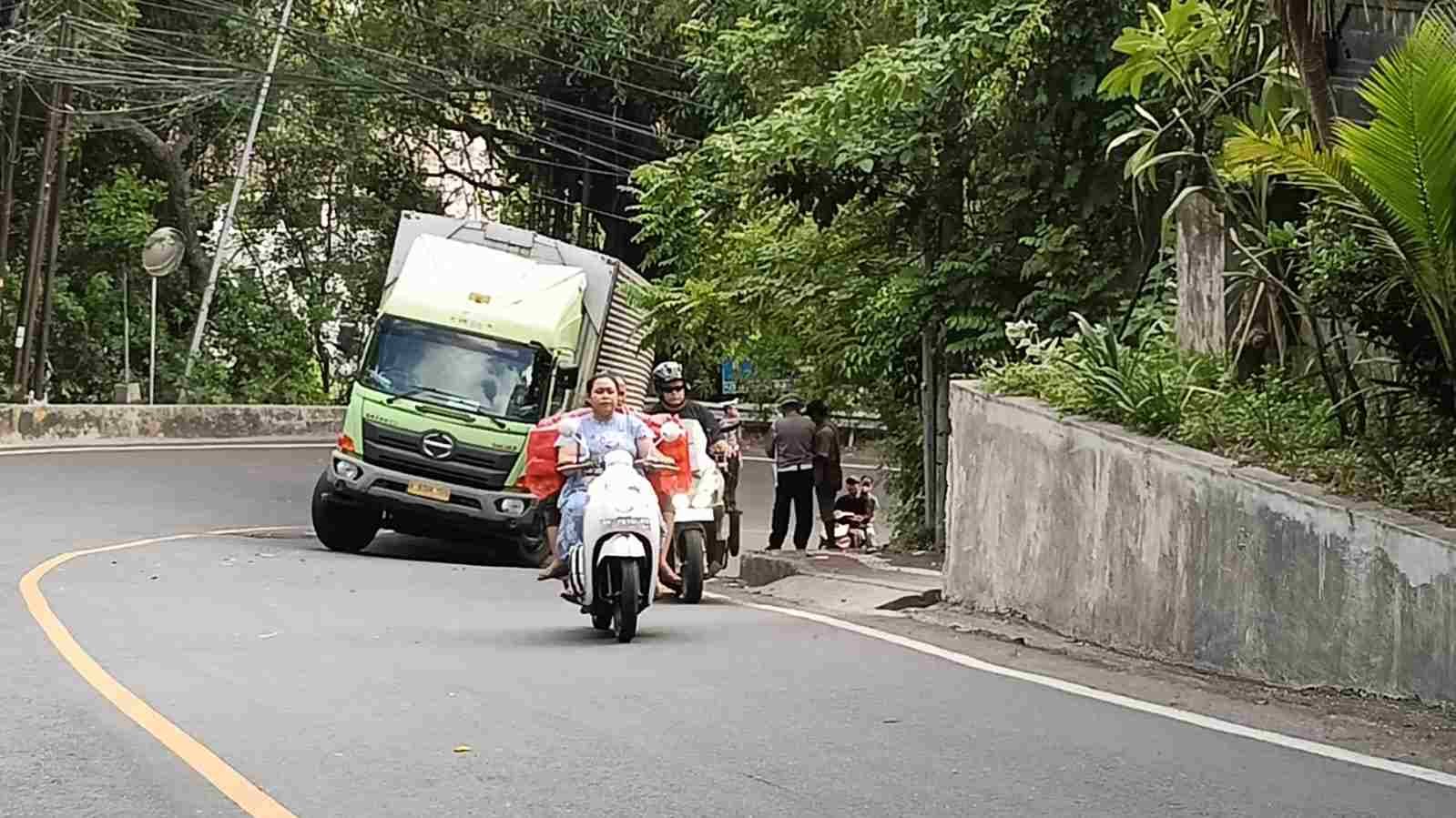 Barometer Bali | Badung – Sebuah truk tronton bermuatan air mineral mengalami gagal nanjak di tanjakan Pura Tegeh Sari, Jalan Uluwatu, Jimbaran, Kecamatan Kuta Selatan, Kabupaten Badung, sekira pukul 07.30 WITA.