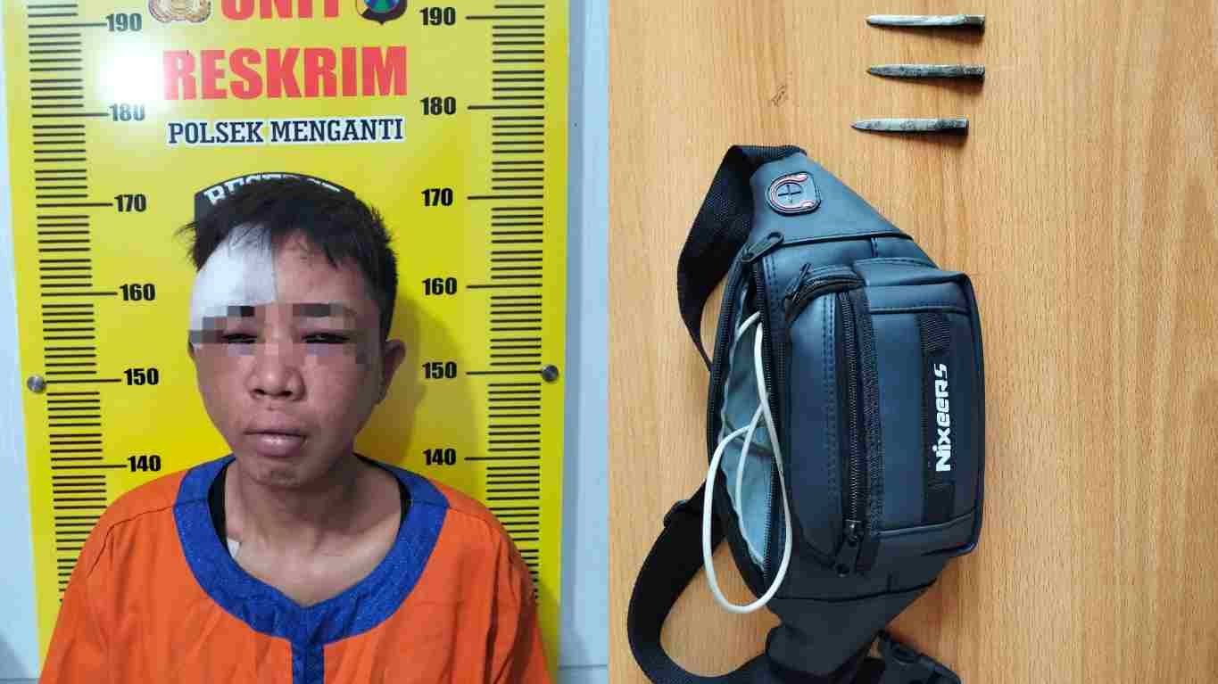 Aksi itu dipergoki saksi yang kemudian meminta bantuan warga serta Unit Reskrim Polsek Menganti yang kebetulan sedang patroli. Dalam upaya melarikan diri, pelaku sempat mengganti baju dari hijau ke merah dan membuang tas di sekitar telaga desa. Petugas bersama saksi yang sudah mengenali ciri-ciri pelaku melakukan penyisiran. Dari tas yang ditemukan, polisi mengamankan kunci letter T dan pembuka magnet kontak motor. Tak lama, terduga berhasil diamankan beserta barang buktinya.