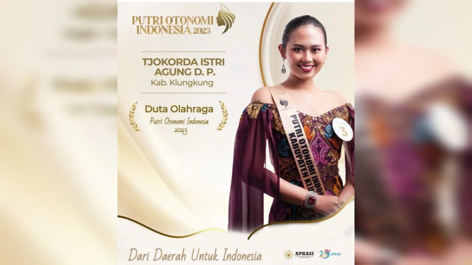 Denpasar | barometerbali – Mahasiswi Program Studi (Prodi) Sarjana Peternakan angkatan 2021, Fakultas Peternakan Tjokorda Istri Agung Dewi P berhasil mengharumkan nama Universitas Udayana (Unud) dalam ajang Pemilihan Putri Otonomi Indonesia (POI) 2023 dan terpilh menjadi Duta Olahraga Putri Otonomi Indonesia 2023 mewakili Kabupaten Klungkung, seperti yang dikutip pada Sabtu (1/7/2023).