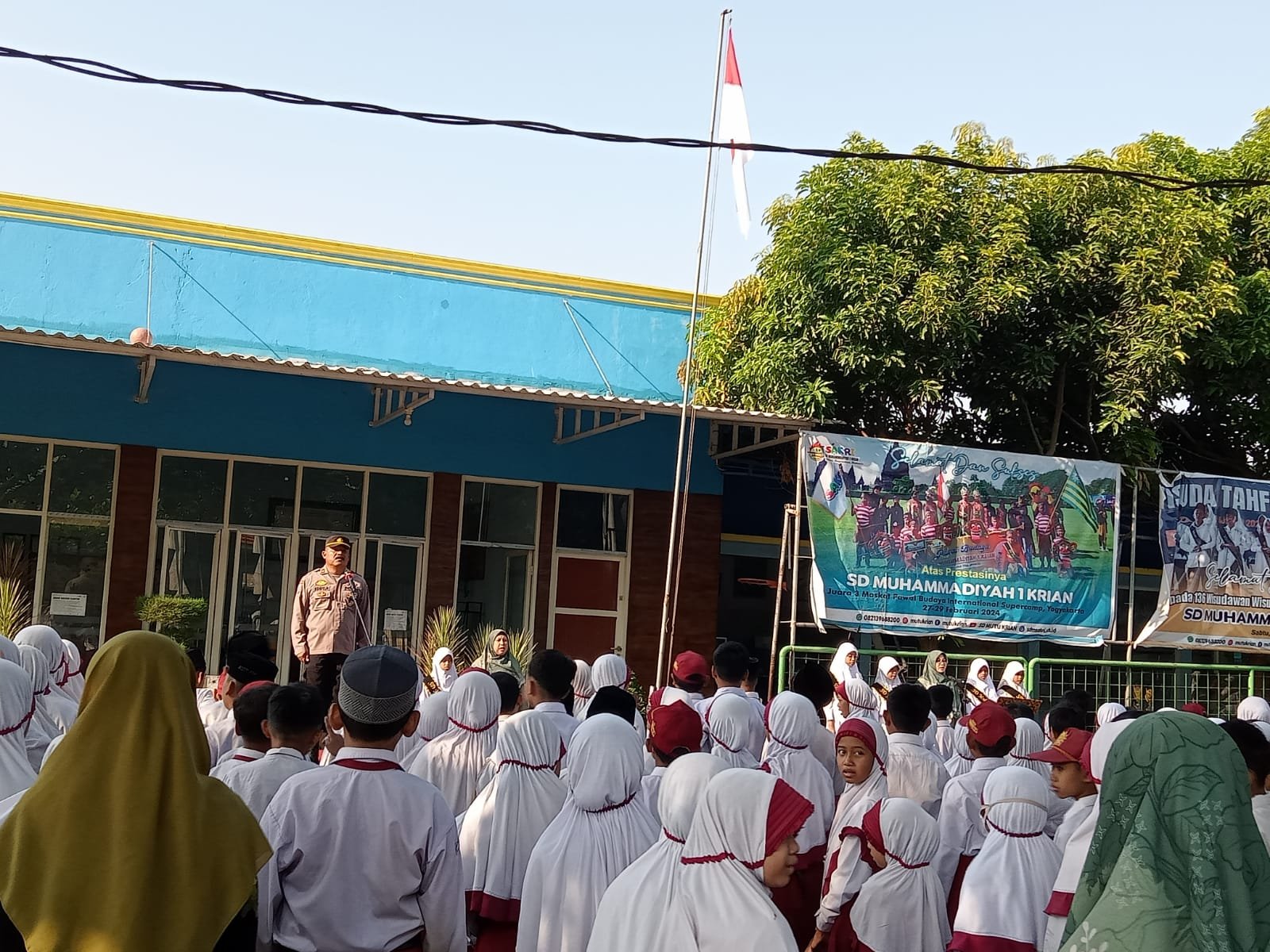 Sidoarjo | barometerbali – Polsek Krian Polresta Sidoarjo memberikan edukasi bullying dan bijak penggunaan media sosial kepada pelajar, dalam kegiatan upacara bendera di SD Muhammadiyah 1, Krian, Sidoarjo, pada Senin (7/10/2024).