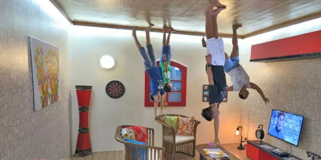 Tidak hanya ruangan, semua isi ruangan seperti tempat tidur, bantal, televisi, lemari, rak juga di buat terbalik.