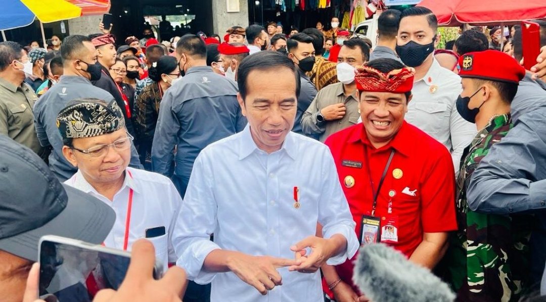 Presiden Joko Widodo (Jokowi) didampingi Gubernur Bali Wayan Koster (kiri) dan Bupati Tabanan Komang Sanjaya (kanan) memberikan keterangan kepada awak media usai mengunjungi Pasar Baturiti, Kecamatan Baturiti, Kabupaten Tabanan, Bali pada Kamis, (2/2/2023). Foto: BPMI Setpres/Laily Rachev