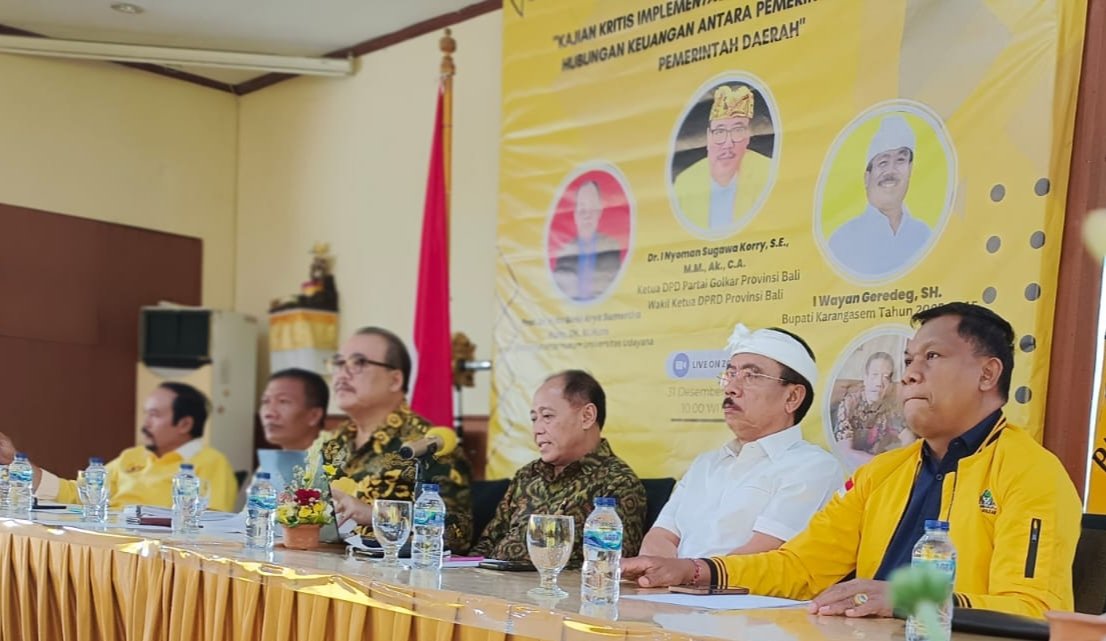 “Terus terang saya menyatakan DPR RI kita belum melakukan satu kesatuan membela hal ini karena saya tidak melihat satu pun statemen pembahasan memperjuangkan hal ini,” tegas Sugawa Korry dalam webinar bertajuk “Kajian Kritis Implementasi UU Nomor 1 Tahun 2022 tentang Hubungan Keuangan Pusat dan Daerah”, di Sekretariat DPD Partai Golkar Bali Jalan Surapati, Denpasar, Sabtu (31/12/2022).