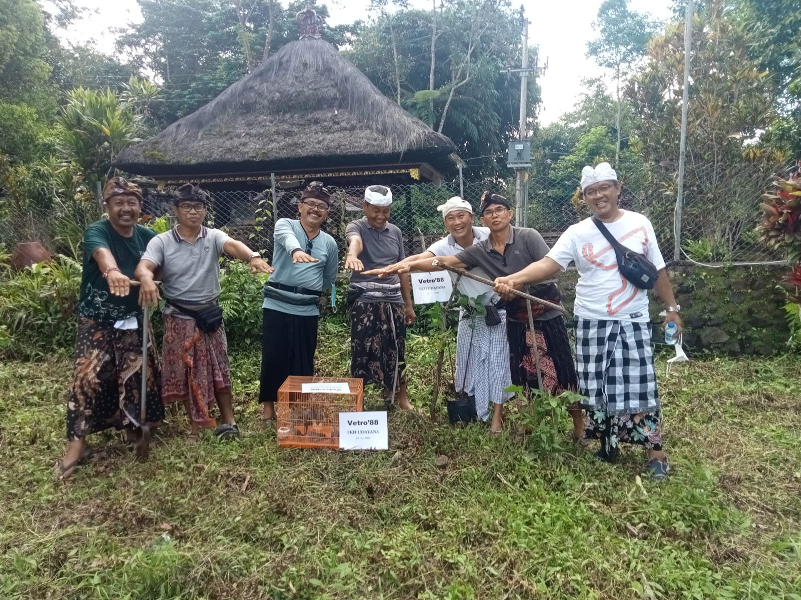 Caption: Vetro88 dalam aksi penanaman pohon langka untuk bahan upakara dan pelepasliaran burung titiran di pelaba Pura Luhur Pucak Petali, Jumat (15/4/2022) pagi. (Foto: BB/v88)
