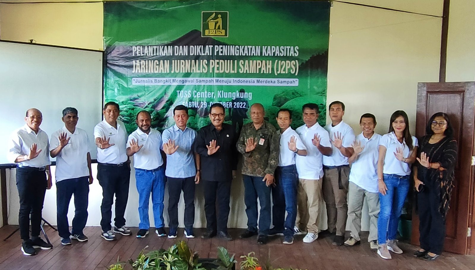 Foto: Wagub Bali Cok Ace, Kadis Kehutanan dan Lingkungan Hidup Prov Bali, Bupati Klungkung Nyoman Suwirta, jajaran Pengurus Jaringan Jurnalis Peduli Sampah (J2PS) yang baru dilantik dan narasumber diklat peningkatan kapasitas pengelolaan sampah di Aula TOSS Gema Santi, Karangdadi, Desa Kusamba, Klungkung, Sabtu (29/10/2022).