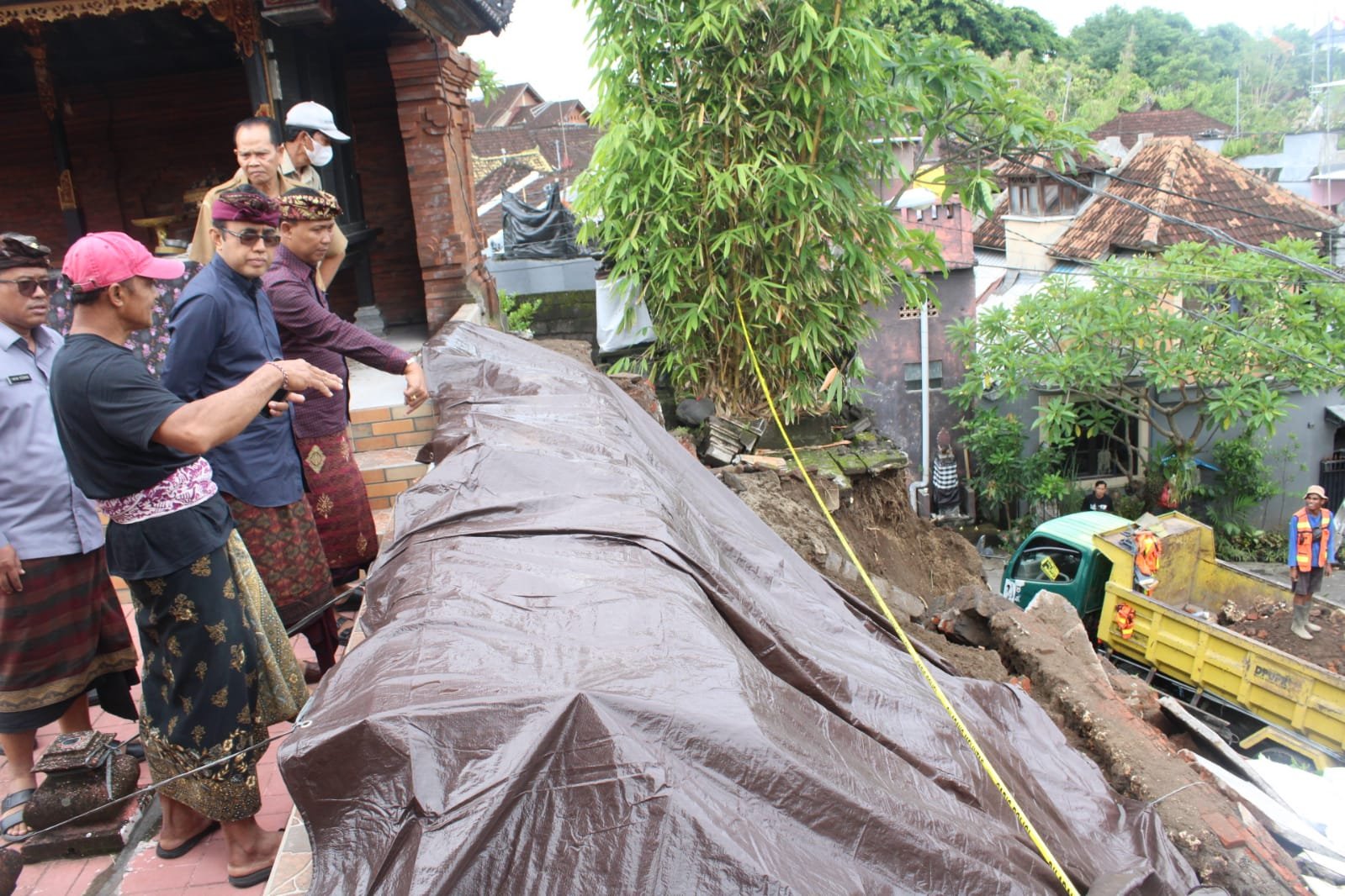 Denpasar | barometerbali – Jebolnya tembok beton di area belakang Pura Dalem Jagat Sidakarya, Banjar Bantas Peraupan, Jalan Antasura, Peguyangan Kangin, Denpasar Utara pada minggu (25/12) lalu akibat cuaca ekstrem disertai curah hujan tinggi langsung mendapat atensi dari Walikota Denpasar, IGN Jaya Negara yang meninjau ke lokasi bencana.