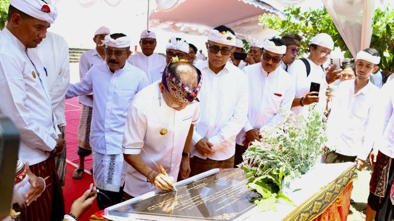 Foto: Peresmian Wantilan Segara ditandai dengan penandatangan prasasti di Pantai Padanggalak, Jumat (14/3). (barometerbali/ays/rah)