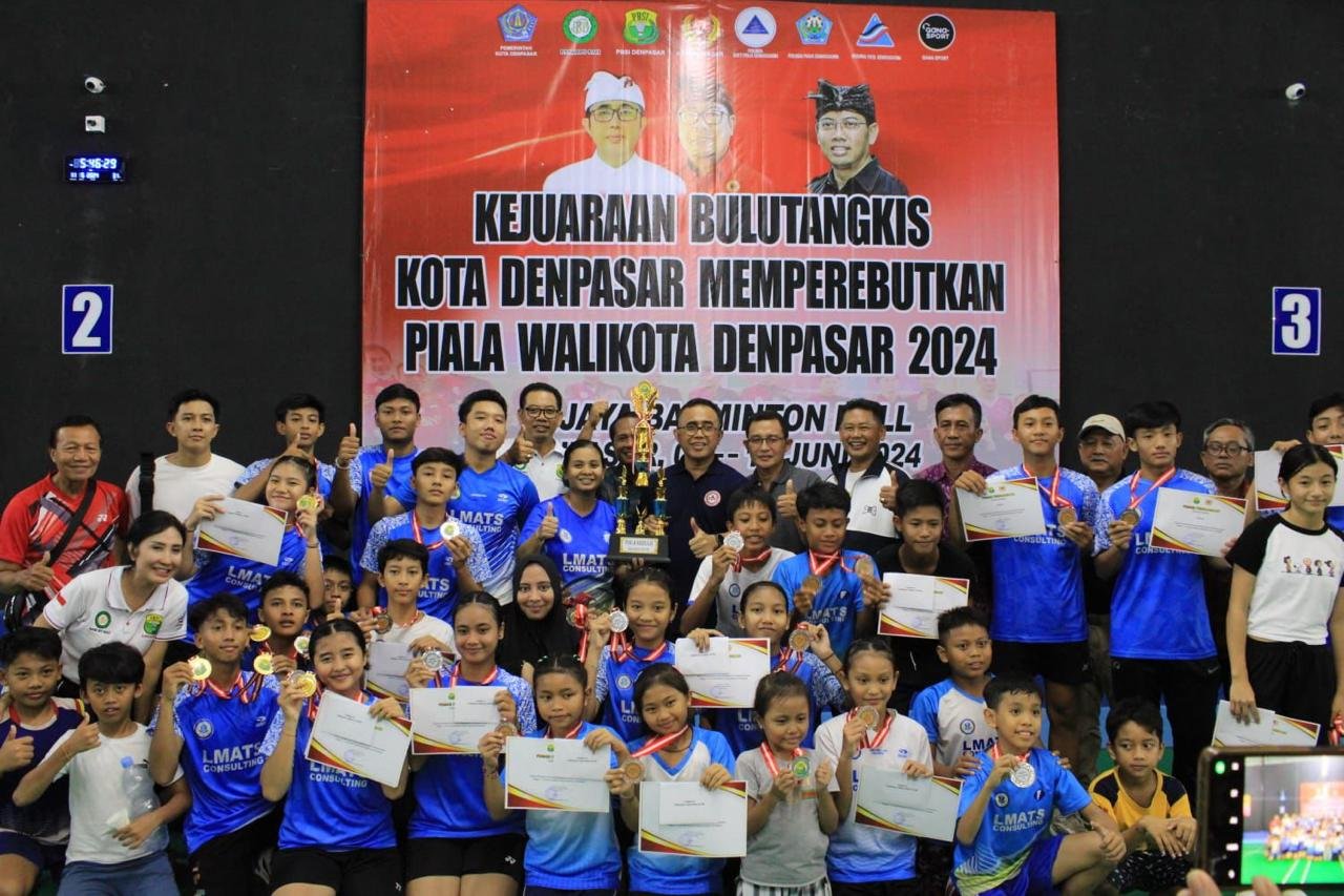 Ket foto: Walikota Denpasar, I.G.N Jaya Negara didampingi Ketua Umum Pengkot Persatuan Bulu Tangkis Seluruh Indonesia (PBSI) Kota Denpasar, I Ketut Suteja Kumara, serahkan Piala Bergilir Walikota kepada Juara 1 hingga 3 dan piagam untuk seluruh pemain, Bulutangkis Walikota Cup XIV di GOR Wijaya Badminton Hall pada, Selasa (11/6/2024). (Sumber: hmsdps).