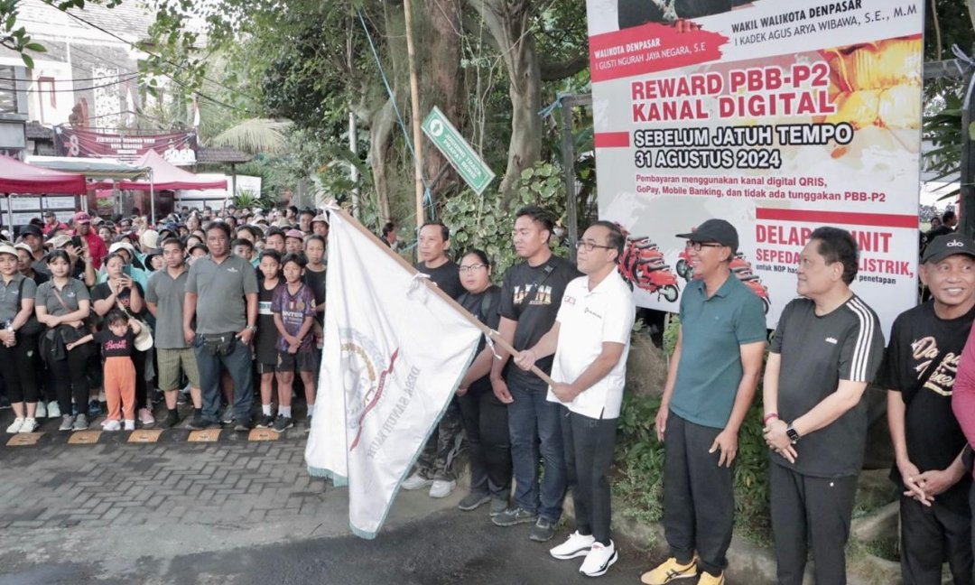 Ket foto: Walikota Denpasar, I Gusti Ngurah Jaya Negara melepas secara resmi Jalan Sehat Desa Sanur Kauh yang di tandai dengan pengibasan bendera di depan Kantor Desa Sanur Kauh, Sabtu (1/6/2024) pagi. (Sumber: BB/ays)