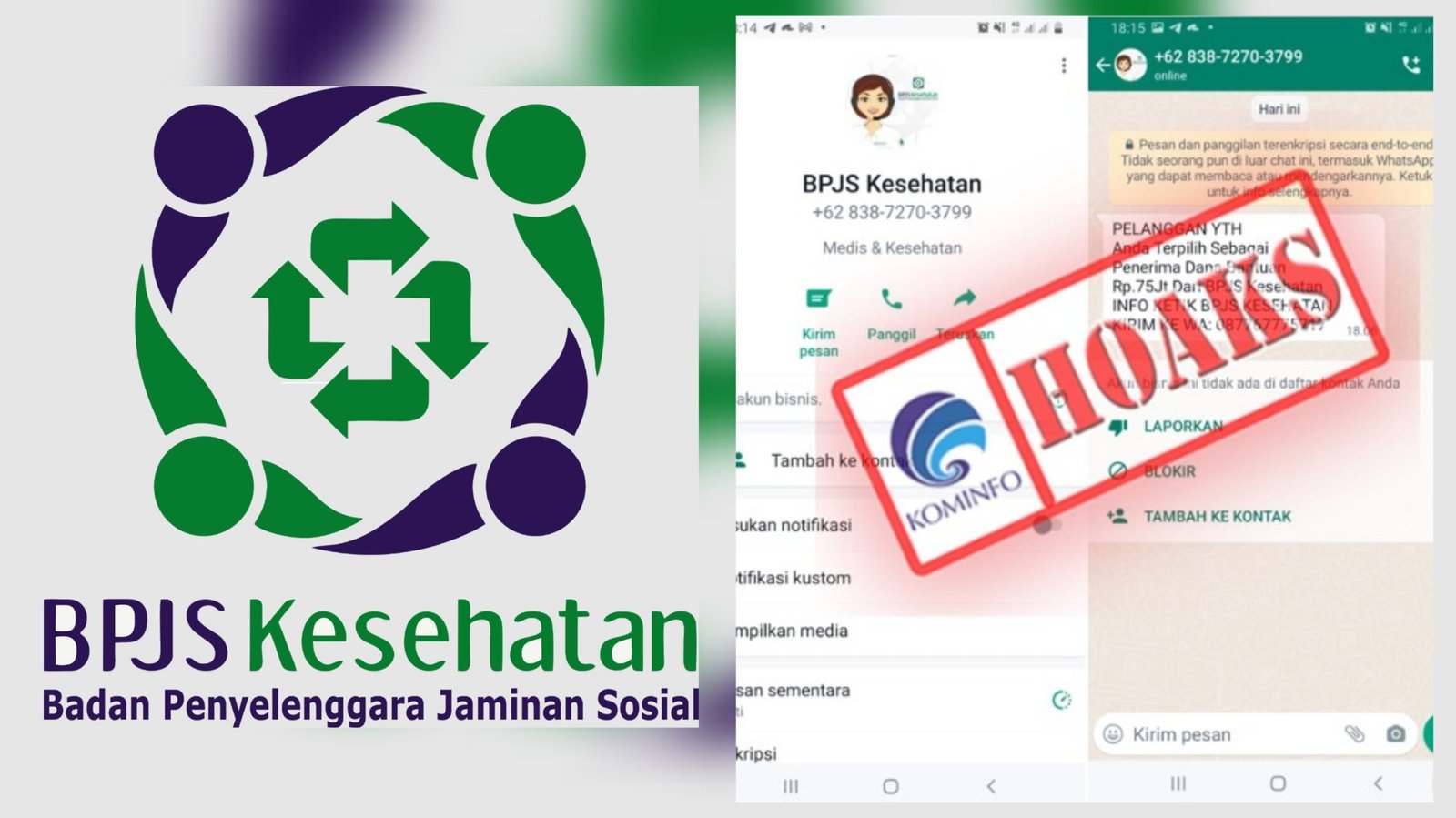 Kolase: Logo BPJS Kesehatan dan pengumuman di situs Kemenkominfo RI terkait hoaks yang mengatasnamakan BPJS Kesehatan. (BB/Hms BPJS Kesehatan)