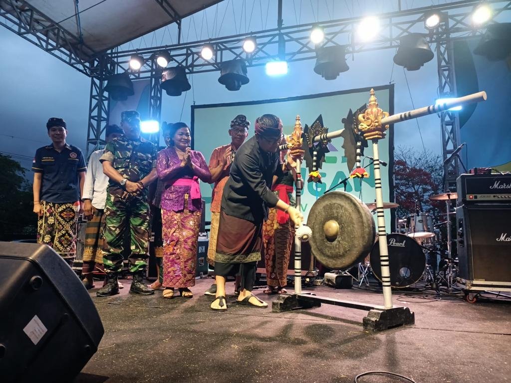 Foto: Wakil Walikota Denpasar, I Kadek Agus Arya Wibawa membuka secara resmi Serangan Festival Tahun 2023 ditandai dengan pemukulan gong di Lapangan I Wayan Bulit, Kelurahan Serangan, Jumat (1/12/2023). (BB/HMS)