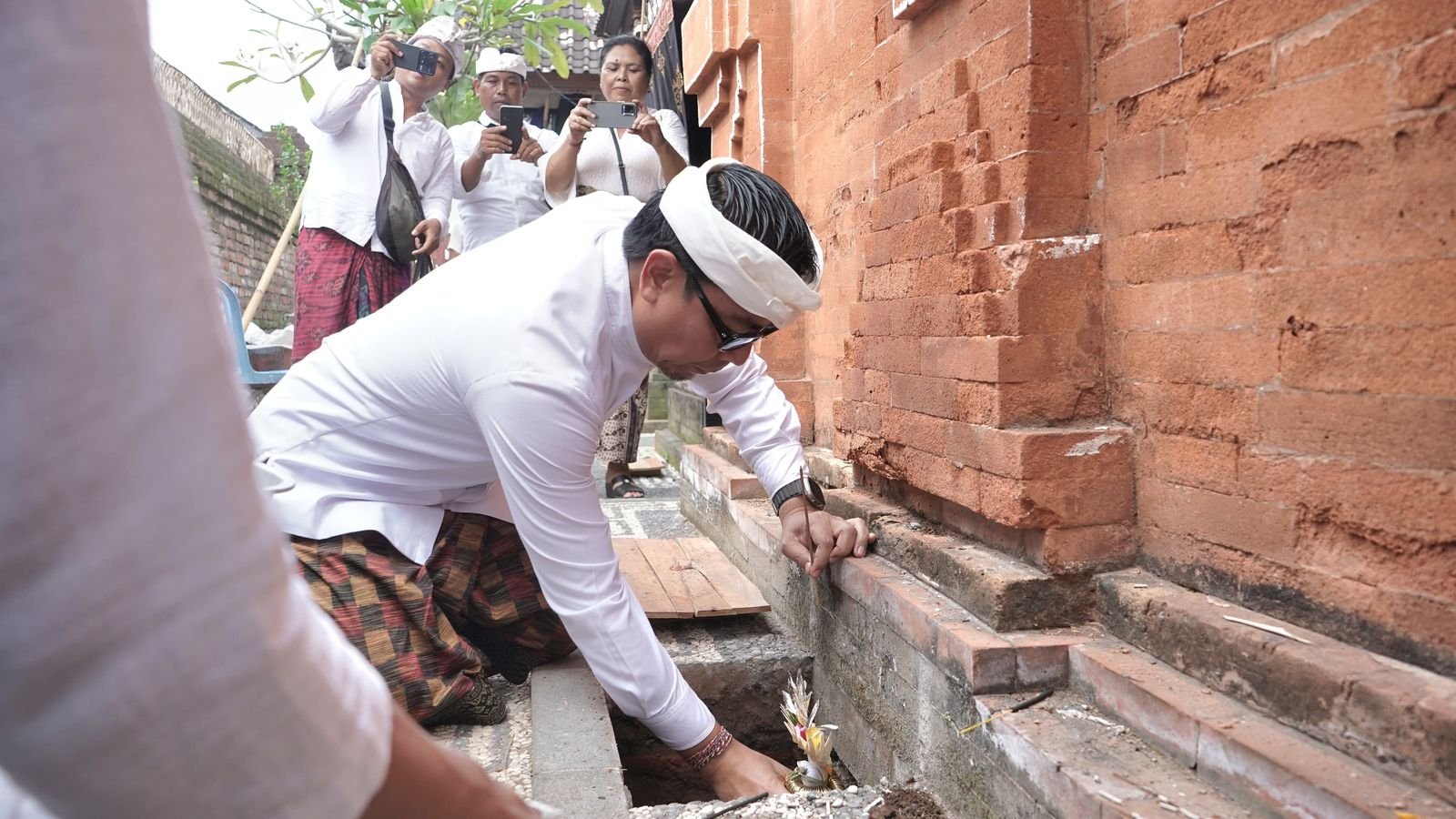 Barometerbali.com | Denpasar – Wakil Wali Kota Denpasar, I Kadek Agus Arya Wibawa menghadiri sekaligus berkesempatan mendem pedagingan di gedong catu serangkaian Karya Ngenteg Linggih, Mamungkah Nubung Pedagingan Wrespati Kalpa Agung di Pura Kawitan Mpu Aji Dukuh Sakti, Desa Adat Kesiman, Denpasar Timur bertepatan dengan Rahina Sugihan Bali pada, Jumat (18/4).