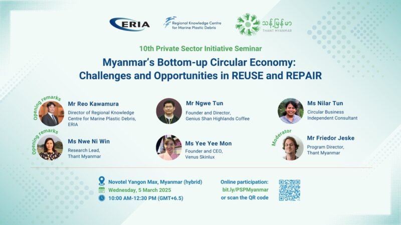 The Regional Knowledge Centre for Marine Plastic Debris of ERIA, in collaboration with Thant Myanmar, is hosting a webinar titled “Myanmar’s Bottom-Up Circular Economy: Challenges and Opportunities in REUSE and REPAIR.” This event will showcase Myanmar’s unique approach to circular economy practices, particularly in reducing plastic consumption through reuse and repair systems.