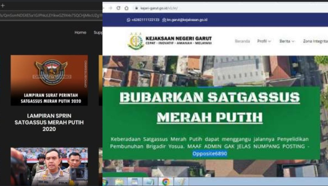 “Tampilan dari website Kejaksaan Negeri Garut berubah menampilkan tulisan ‘BUBARKAN SATGASSUS MERAH PUTIH‘. Sementara di bagian pojok kiri website tersebut, tertulis ‘opposite6890‘,” beber Sumedana.