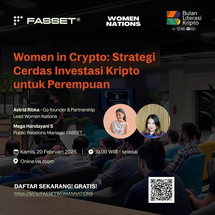 Jakarta I barometerbali – Fasset, platform pertukaran aset kripto berbasis di Dubai menggelar webinar edukatif bertajuk “Women in Crypto: Strategi Cerdas Investasi Kripto untuk Perempuan” dalam rangka Bulan Literasi Kripto 2025. Webinar yang diadakan pada 20 Februari 2025 ini menarik lebih dari 362 peserta, mayoritas perempuan, dan menghadirkan Mega Handayani Supriyanto (Public Relations Manager Fasset) serta Women Nations sebagai mitra kolaborasi. Diskusi berfokus pada strategi investasi, manajemen risiko, tantangan dan peluang bagi perempuan dalam industri kripto serta pentingnya literasi keuangan untuk memberdayakan perempuan dan menghindari jebakan investasi ilegal.
