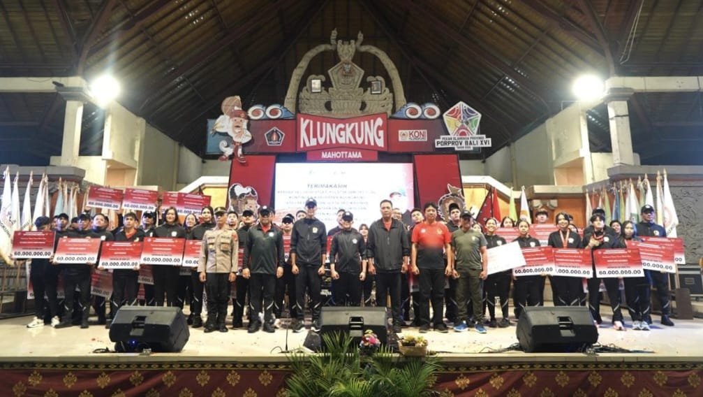 Barometer Bali | Klungkung – Pemerintah Kabupaten Klungkung menunjukkan komitmennya dalam mendukung kemajuan dunia olahraga. Hal tersebut terlihat saat Bupati Klungkung, I Made Satria secara resmi menyerahkan bonus kepada para atlet dan pelatih berprestasi yang telah mengharumkan nama Klungkung pada ajang Pekan Olahraga Provinsi (Porprov) Bali 2025 di Balai Budaya Ida Dewa Agung Istri Kanya, Kabupaten Klungkung, Minggu (12/10). Turut hadir Wakil Bupati Klungkung, Tjokorda Gde Surya Putra, Sekda Kabupaten Klungkung, Anak Agung Gede Lesmana serta undangan terkait lainnya.