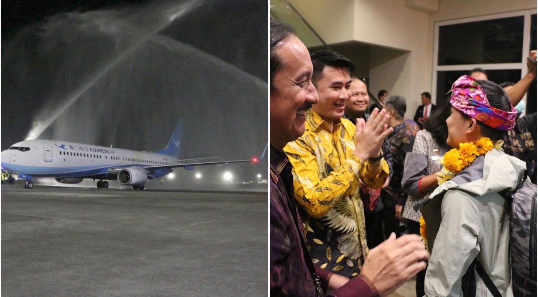 Xiamen Airlines dengan nomor penerbangan CXA-891 (kiri) membawa 142 penumpang dari Xiamen, Tiongkok, mendarat di Bandara Internasional I Gusti Ngurah Rai – Bali, disambut sejumlah pejabat di Bali, Jumat (3/3/2023) pukul 22.55 Wita. (Kolase: BB/Hms AP1/Byg)
